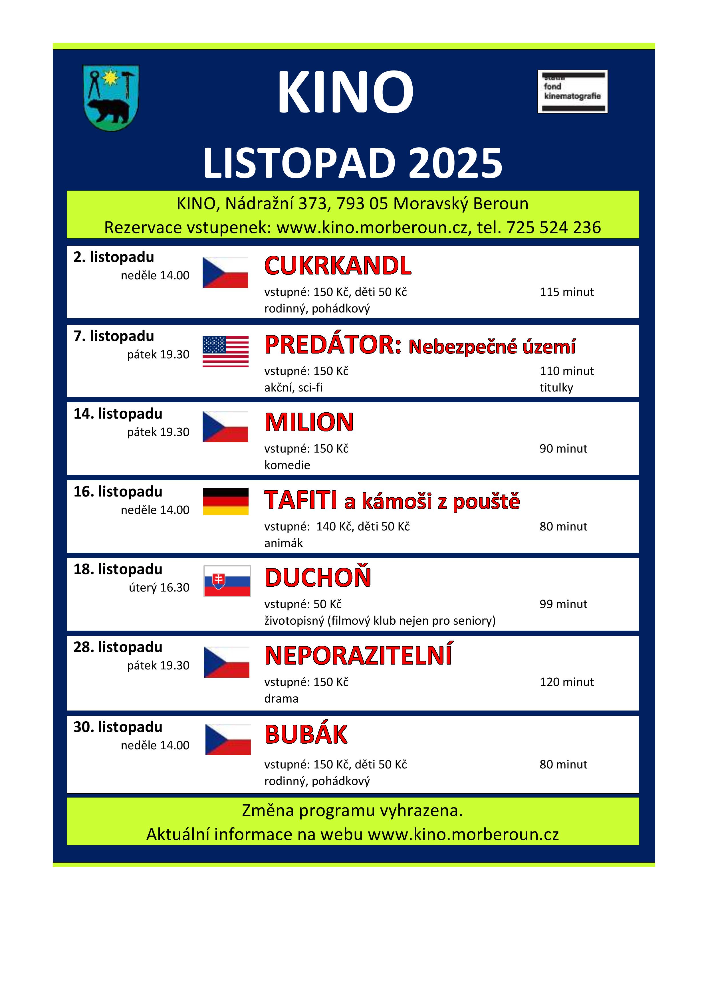 Kino v Moravském Berouně připravilo bohatý program na listopad 2025. V nabídce jsou jako každý měsíc animované filmy pro děti, komedie a akční dobrodružství, ale také zajímavá přednáška a také divadelní představení.
