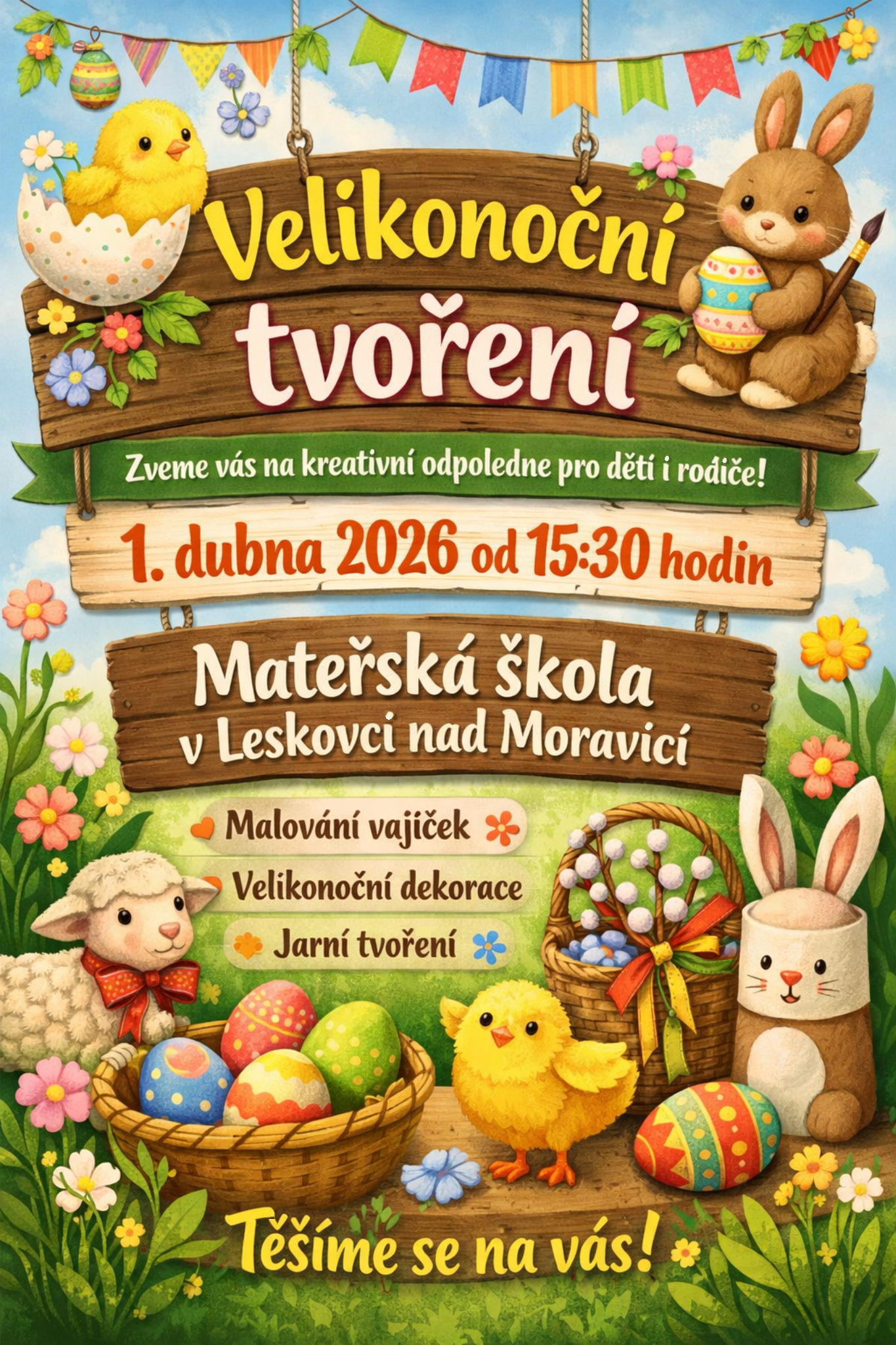 Přijďte si užít kreativní odpoledne, které se koná 1. dubna 2026 od 15:30 hodin v Mateřské škole v Leskovcí n. M. Akce je určena pro rodiče a mladé lidi, kteří se chtějí zapojit do různých tvořivých aktivit a strávit příjemný čas společně.